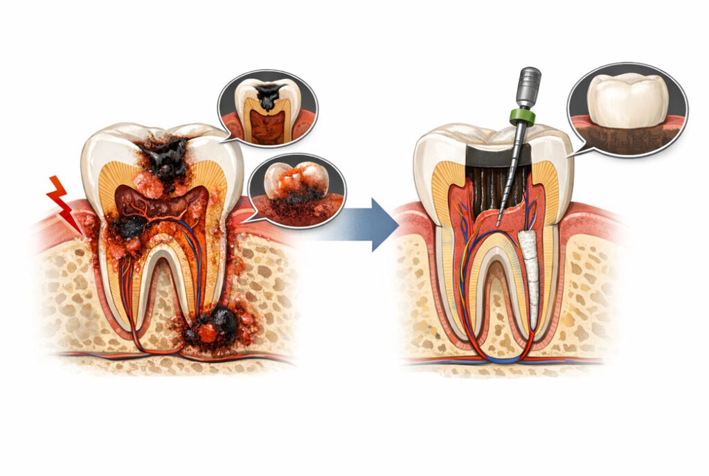 如果牙齒受到外力,或因蛀牙、牙周病等因素導致牙髓嚴重發炎甚至壞死,就可能需要進行根管治療。若未處理,發炎可能引起劇烈疼痛,並進一步影響牙根周圍組織與齒槽骨,造成牙齒鬆動、咀嚼困難,最後甚至需要拔除。